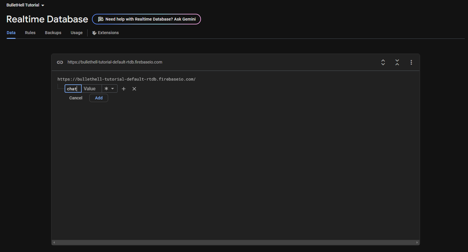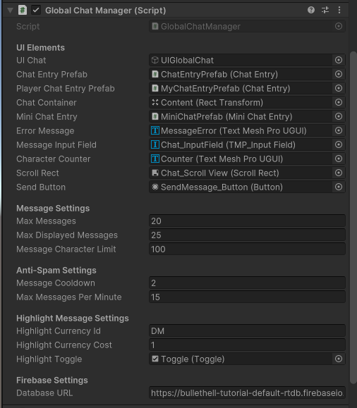 * Paste this URL into the **Database URL** field in the **GlobalChatManager** component.