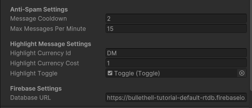 * **highlightCurrencyId (string)**: The in-game currency ID required to highlight a message. This can be customized according to your in-game economy.